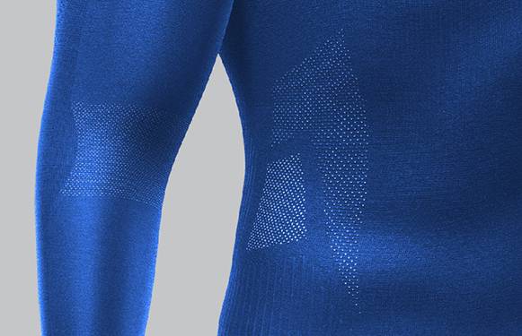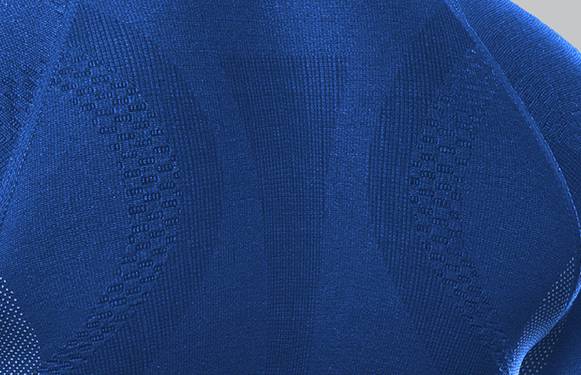 The 3D Weaved Channel has 10 micro pores per square centimeter (10/cm²). These micro pores remain in continual contact with the skin, regulating body temperature to maintain it within the optimum range for athletic performance.