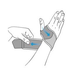 Insert the thumb in the thumb loop. Pull the support across the outside of the hand to the inside (palm).